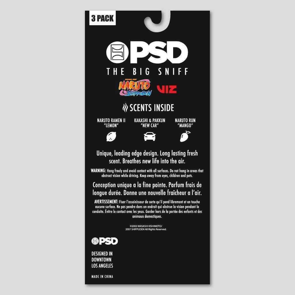 Give your car a new style and scent with PSD’s new “Naruto” air freshener 3-pack. With a large photo of 3 Naruto characters and lemon, new car, and mango scent, this air freshener will do its job freshening your car in style.
