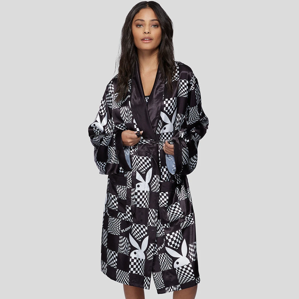Complete your Playboy look with the new Unisex Playboy Warp Check Robe. A classic robe silhouette featuring satin-based silky material with the iconic Playboy Bunny logo print, giving you the ultimate Playboy vibes.